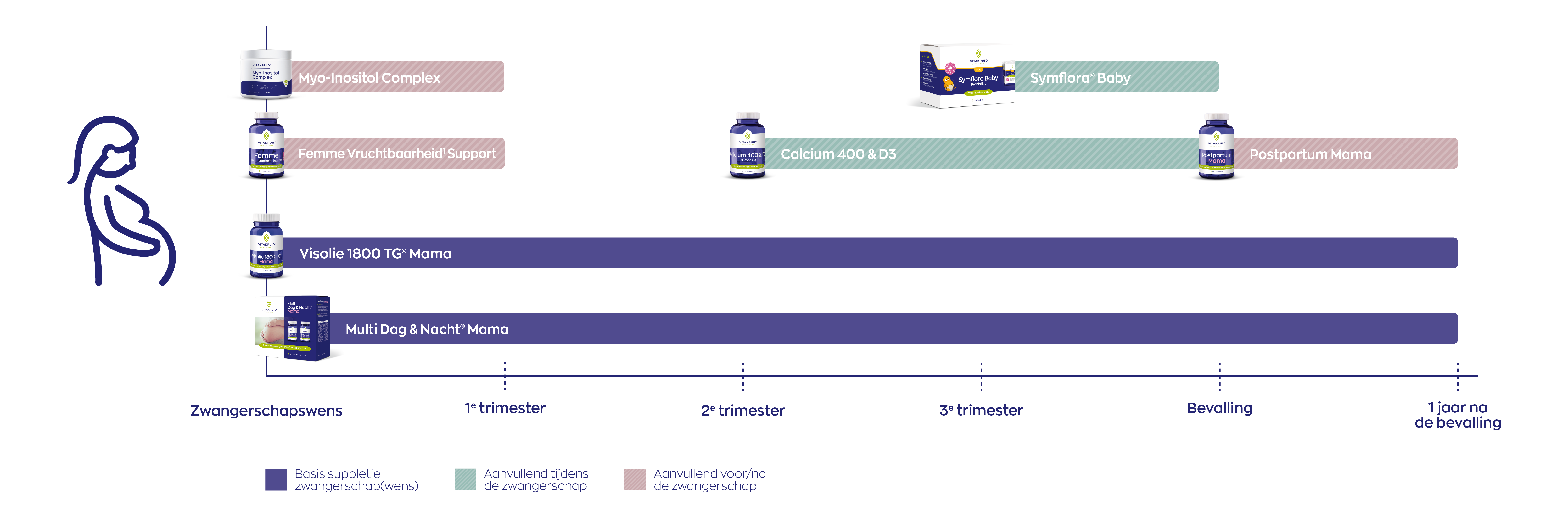 Femme Vruchtbaarheid Support biedt gerichte ondersteuning bij een kinderwens, tot aan de conceptie. Om jouw lichaam voor, tijdens én na de zwangerschap te ondersteunen bestaat ons basisadvies uit Multi Dag & Nacht® Mama en Visolie 1800 TG® Mama. Aanvullend op deze basis suppletie is er extra en gerichte ondersteuning mogelijk voor tijdens en na de zwangerschap, zoals weergegeven in de tijdlijn hieronder.