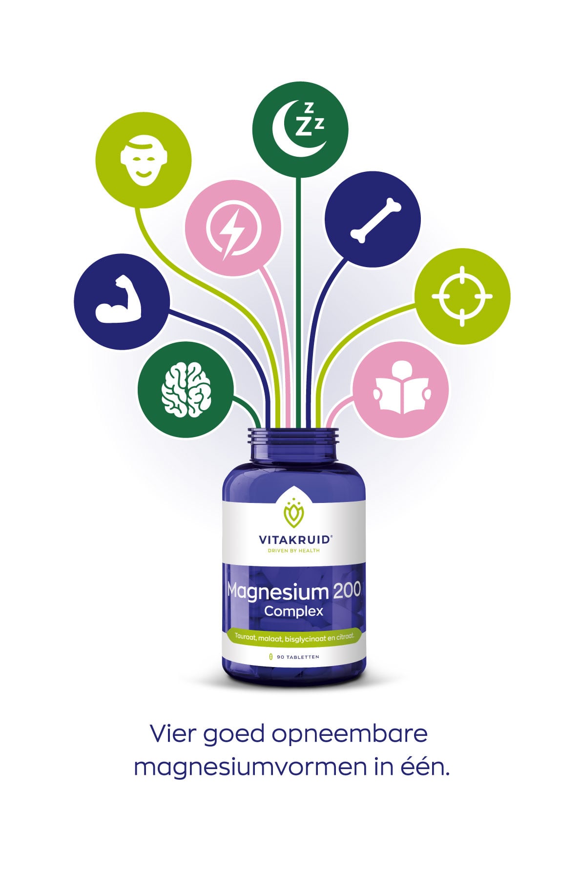 Magnesium 200 Complex combineert meerdere magnesiumvormen in één samengestelde formule, bedoeld voor wie magnesium optimaal wil benutten met een hoge elementaire hoeveelheid magnesium. Dit getal geeft aan hoeveel puur magnesium het supplement bevat, los van de stof waaraan het is gebonden. Magnesium 200 Complex bevat vier kwalitatieve vormen, waaronder twee aminozuurgecheleerde vormen en twee organische vormen. Met een dagelijkse dosering van 200 mg elementair magnesium vormt Magnesium 200 Complex een evenwichtige en doordachte keuze voor dagelijks gebruik.