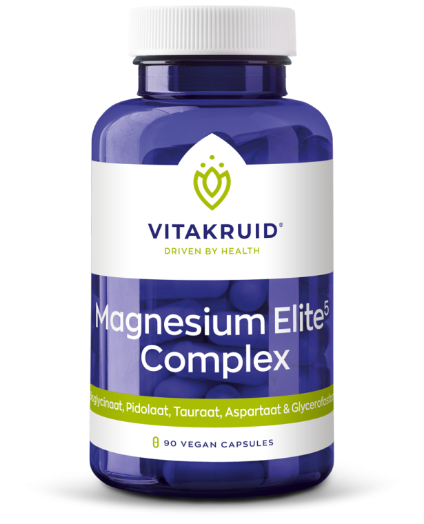 Magnesium Elite5 Complex combineert vijf organische magnesiumvormen. Vier aminozuurgecheleerde vormen: bisglycinaat, pidolaat, tauraat en aspartaat, met magnesiumglycerofosfaat als structurele basis. Samen vormen ze een complete formule die het mineraal effectief opneembaar en breed inzetbaar maakt voor het lichaam.