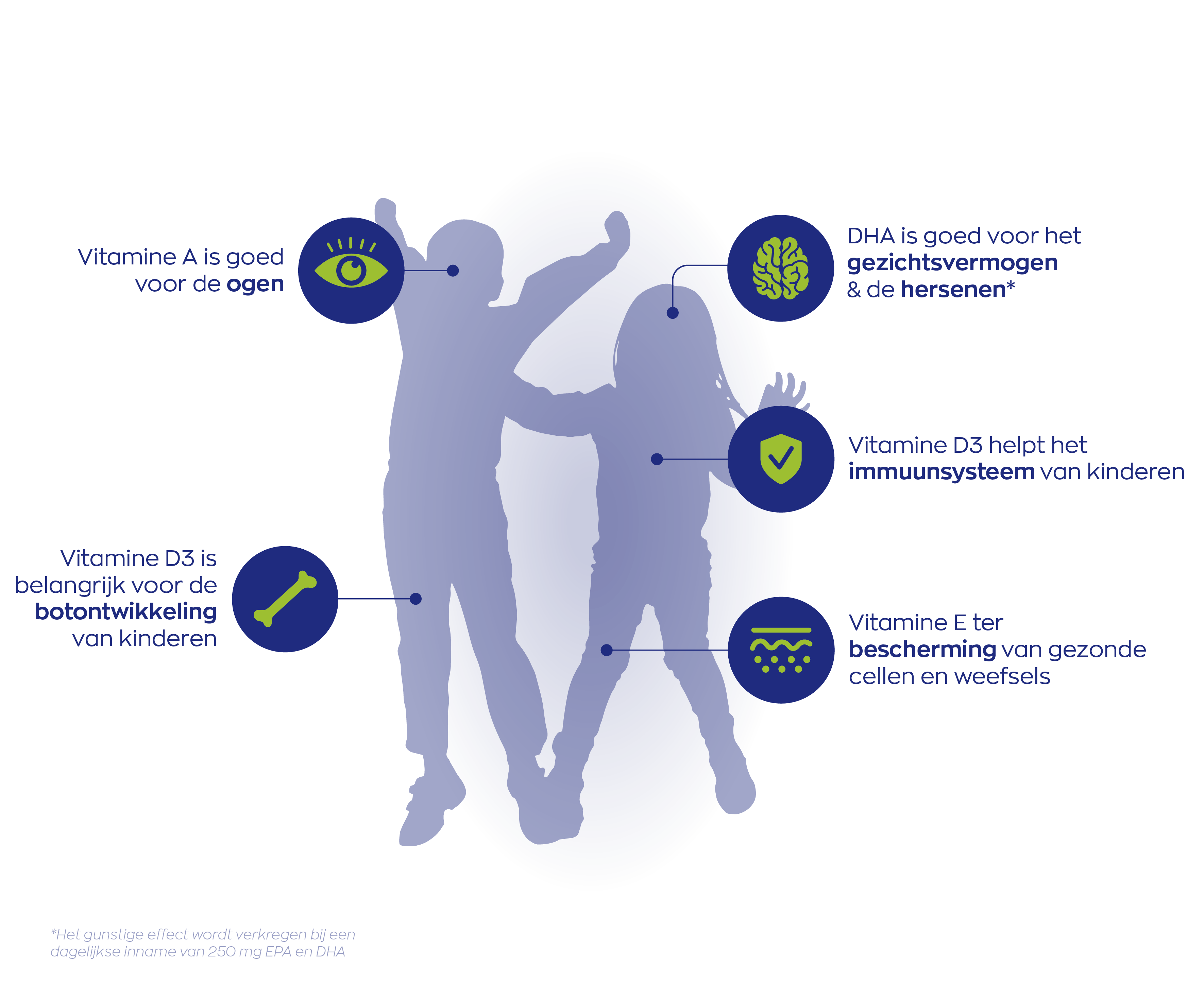• DHA is goed voor het gezichtsvermogen en de hersenen. Bij een minimale inname van 250 mg DHA per dag