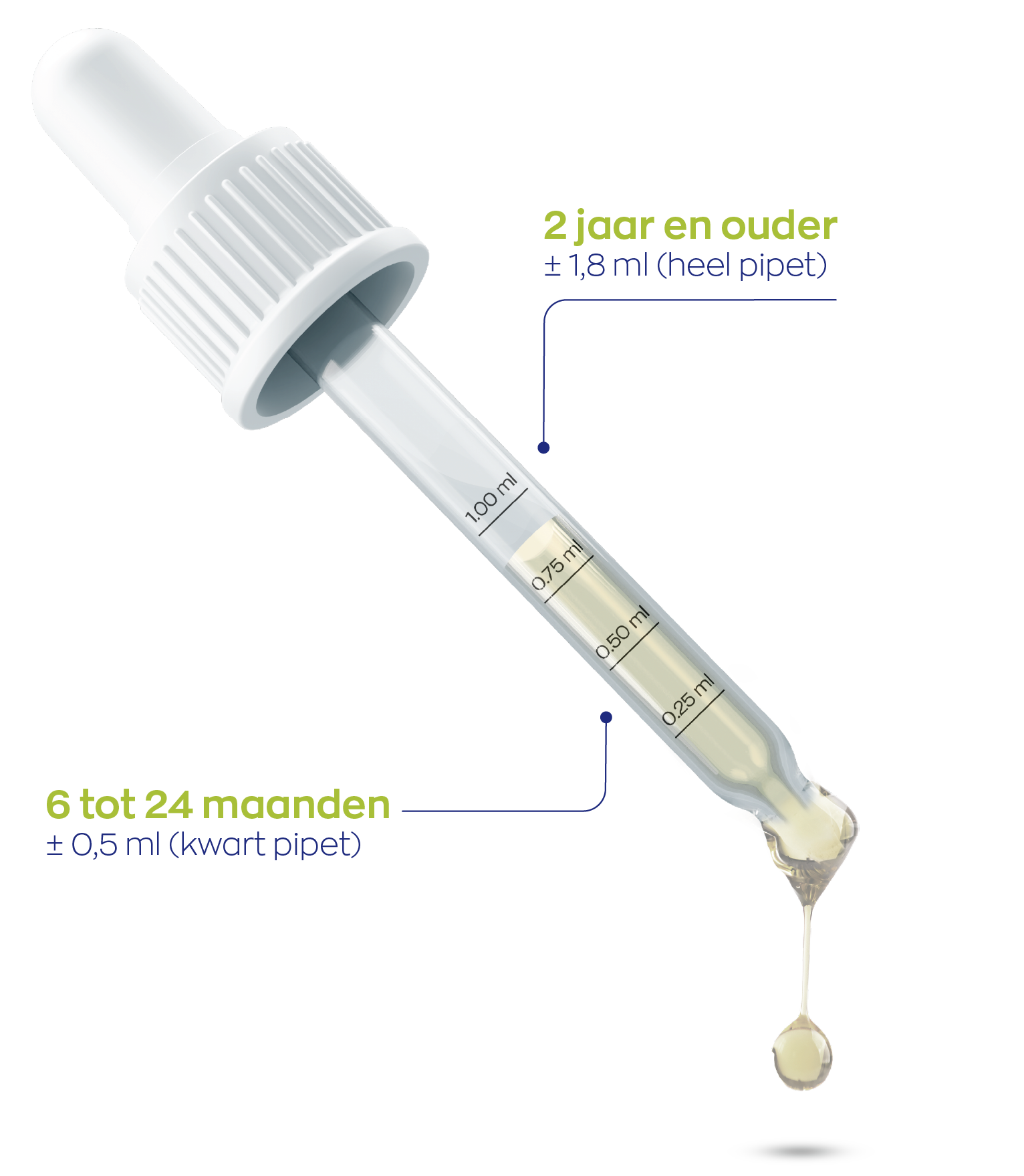 Vanaf 2 jaar kan de dosering worden verhoogd naar 1,8 ml per dag, wat overeenkomt met één volle pipet. In deze leeftijdsfase geldt bovendien het algemene advies voor omega-3 vetzuren dat ook voor volwassenen wordt aangehouden. Deze geadviseerde hoeveelheid sluit aan bij de aanbevelingen van de European Food Safety Authority (EFSA) voor de inname van omega-3 vetzuren bij jonge kinderen.