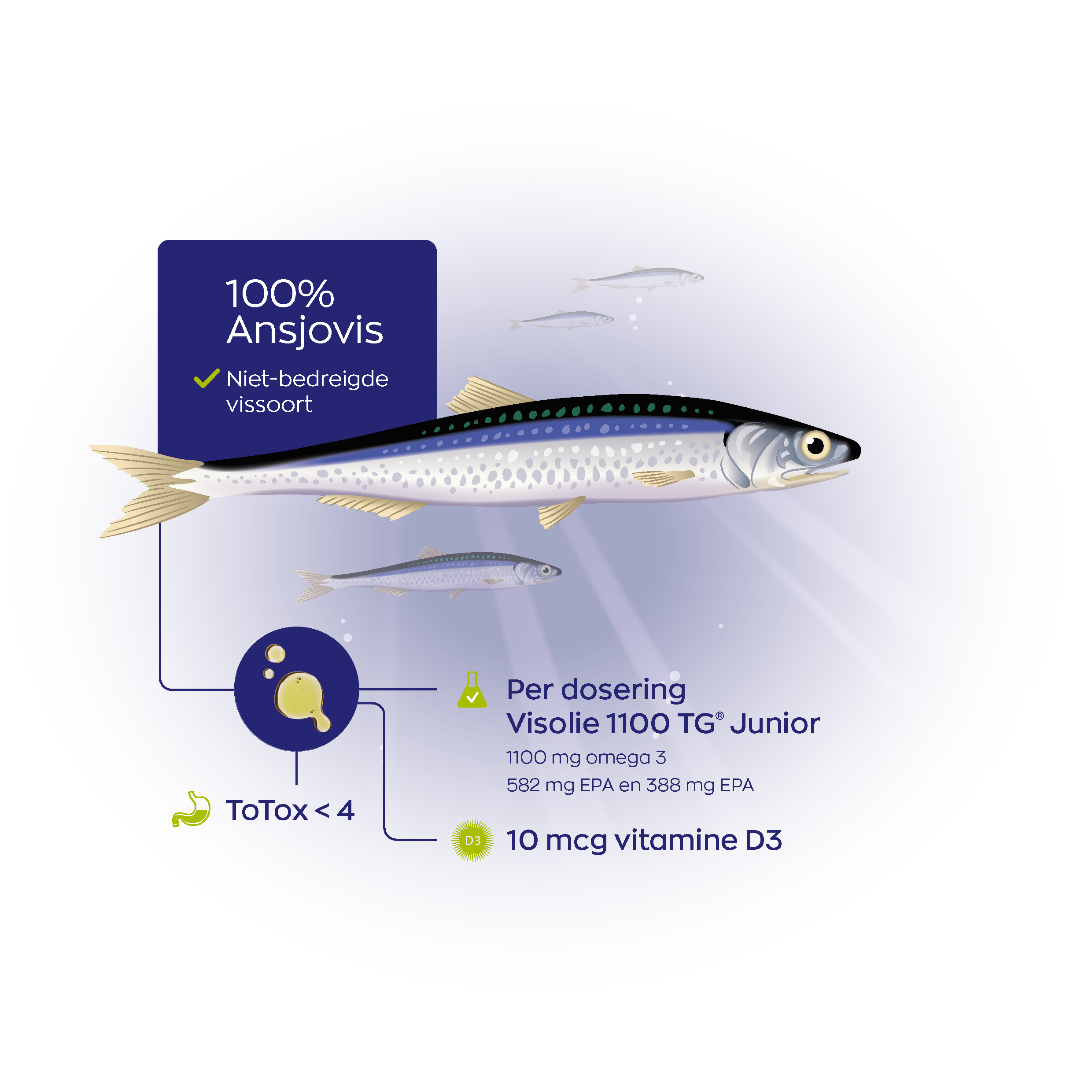 De visolie in Visolie 1100 TG® Junior wordt gewonnen uit ansjovis, een kleine pelagische vissoort die niet tot de bedreigde vissoorten behoort. Ansjovis staat bekend als een rijke en natuurlijke bron van omega-3 vetzuren EPA en DHA.