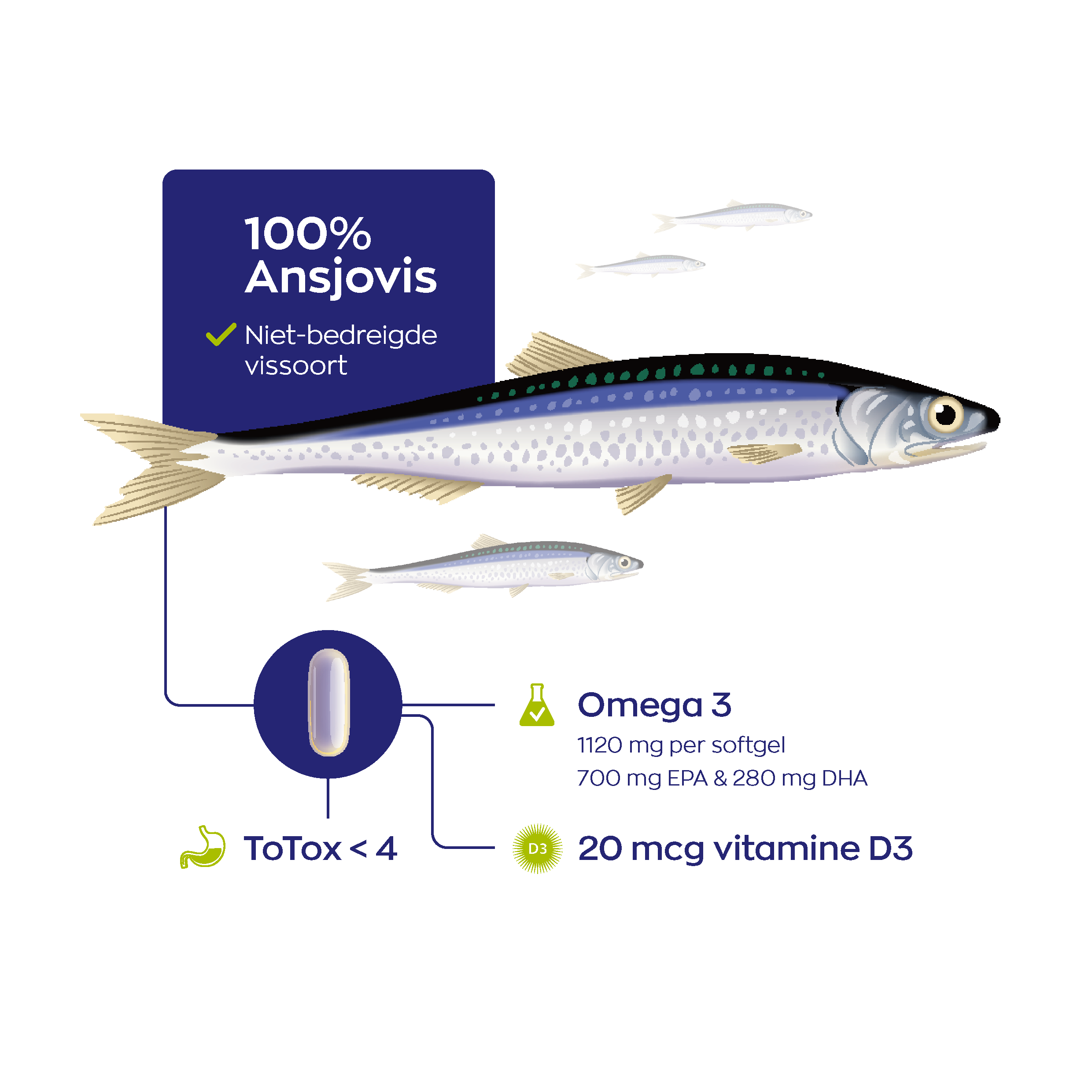 Ansjovis plant zich ook snel voort, waardoor hij niet zo gevoelig is voor overbevissing. Daarnaast vangt onze leverancier, GoldenOmega®, deze vissen in de meest visrijke wateren wereldwijd. GoldenOmega® voldoet zo aan de eisen voor alle belangrijke duurzaamheidscertificaten, waaronder Green-e®, IFOS®, Friend of the Sea® en Marin Trust®.